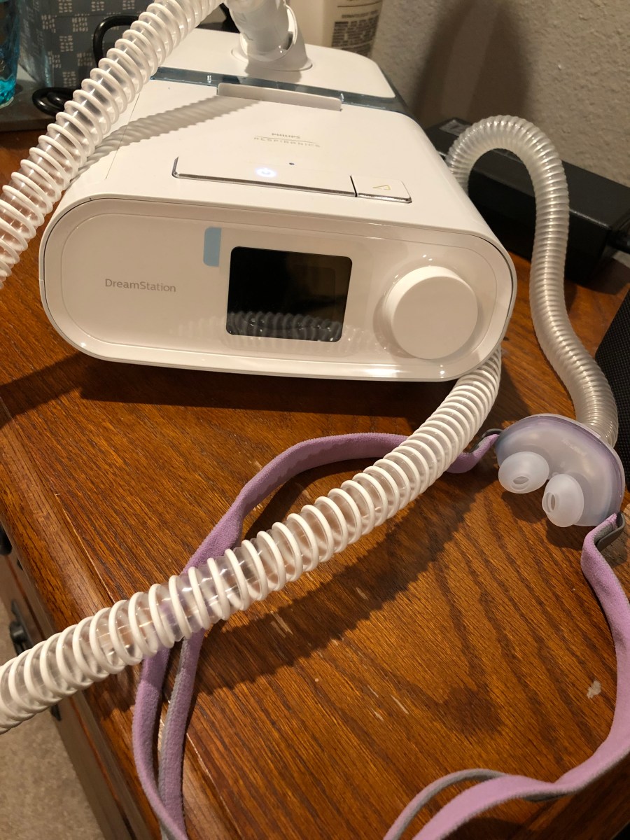 CPAP stands for Continuous Positive Airway Pressure, which is a therapy for folks like me who have Obstructive Sleep Apnea. Basically, it increases the air pressure in my throat so that it doesn’t collapse and cut off my airway while I’m sleeping. There is a mask that fits over the base of my nose with pillow-type cushions that cover my nostrils and a strap that goes around my head to keep it in place while I sleep. Tubing connects the mask to the CPAP machine. The particular machine that I received will automatically adjust the air pressure as I breathe throughout the night.
