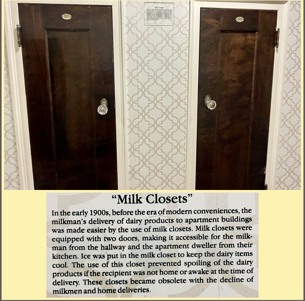 We recently stayed in a hotel on the National Register of Historic Places. It was modern enough to accommodate all of the needs for today with plenty of quirky remnants from the past. We loved the 🥛Milk Closets throughout the hallways. These were used when 🥛milk was delivered to homes. The closets had 🚪doors on both sides- the outside of the house and the inside. In this case, the hotel was once an apartment building- thus the closets in the halls.