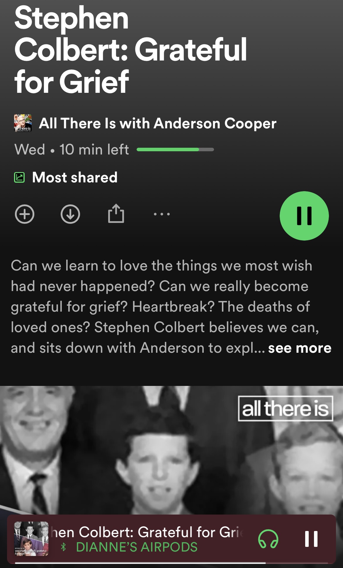 In the Second Episode, Stephen Colbert joins Anderson to discuss how he came to be grateful for grief. Colbert related his experiences following the deaths of his father and two older brothers in an Eastern Airlines 🛩plane crash in 1974 when he was ten. They share insights about living with grief and what it’s like to be older than their fathers were when they died. Their observations about ❤️love and 😢loss are moving and raw. If you’re someone who read the names Cooper and Colbert and can’t get beyond some political notions to see them as people, please think again. This podcast is worth your ⏳time because grief will find all of us at some point in our lives. You can listen to All There Is with Anderson Cooper wherever you get your podcasts.