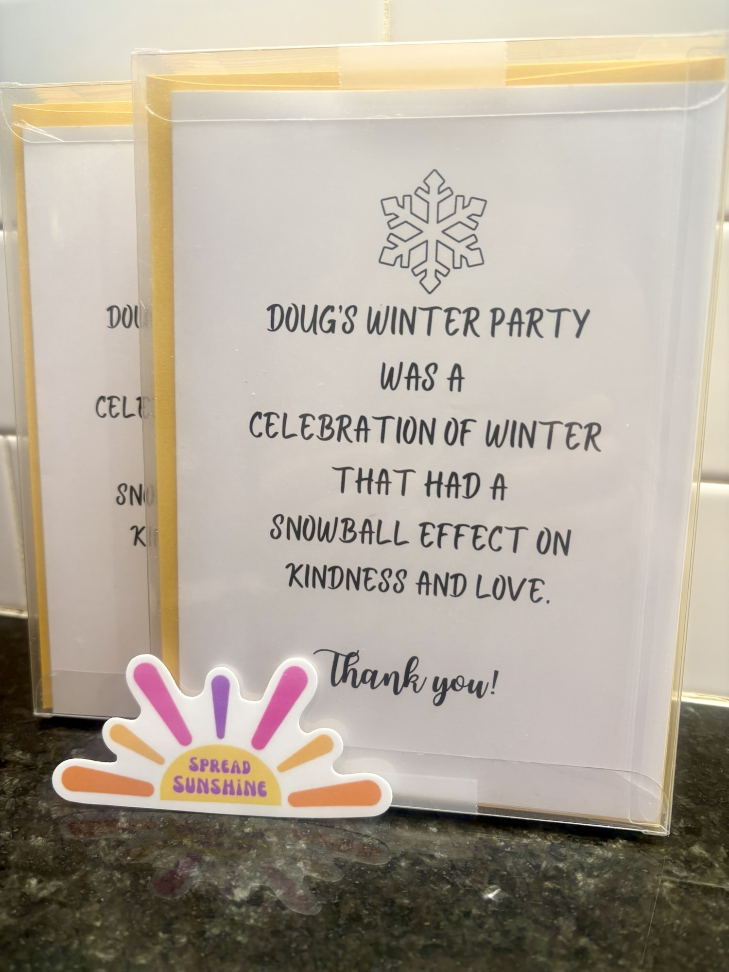 I wanted to be part of the Doug’s Winter Party movement and knew exactly what to do. Doug will have lots of thank you notes to write, so I created a Word Sunshine thank you card, especially for Doug and his Winter Party. He can use the ink and pen again to write his special messages and maybe add some snowflakes.